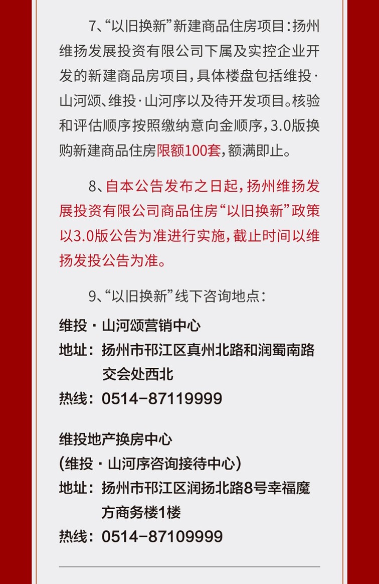 為進(jìn)一步滿足更廣泛客群對(duì)于更高居住品質(zhì)、更美好生活的改善需求,維投地產(chǎn)公布了“以舊換新”3.0版本,將維投·山河序也納入置換范圍,預(yù)計(jì)本周五(5月23日)正式啟動(dòng)置換流程,同時(shí)接受預(yù)約登記。